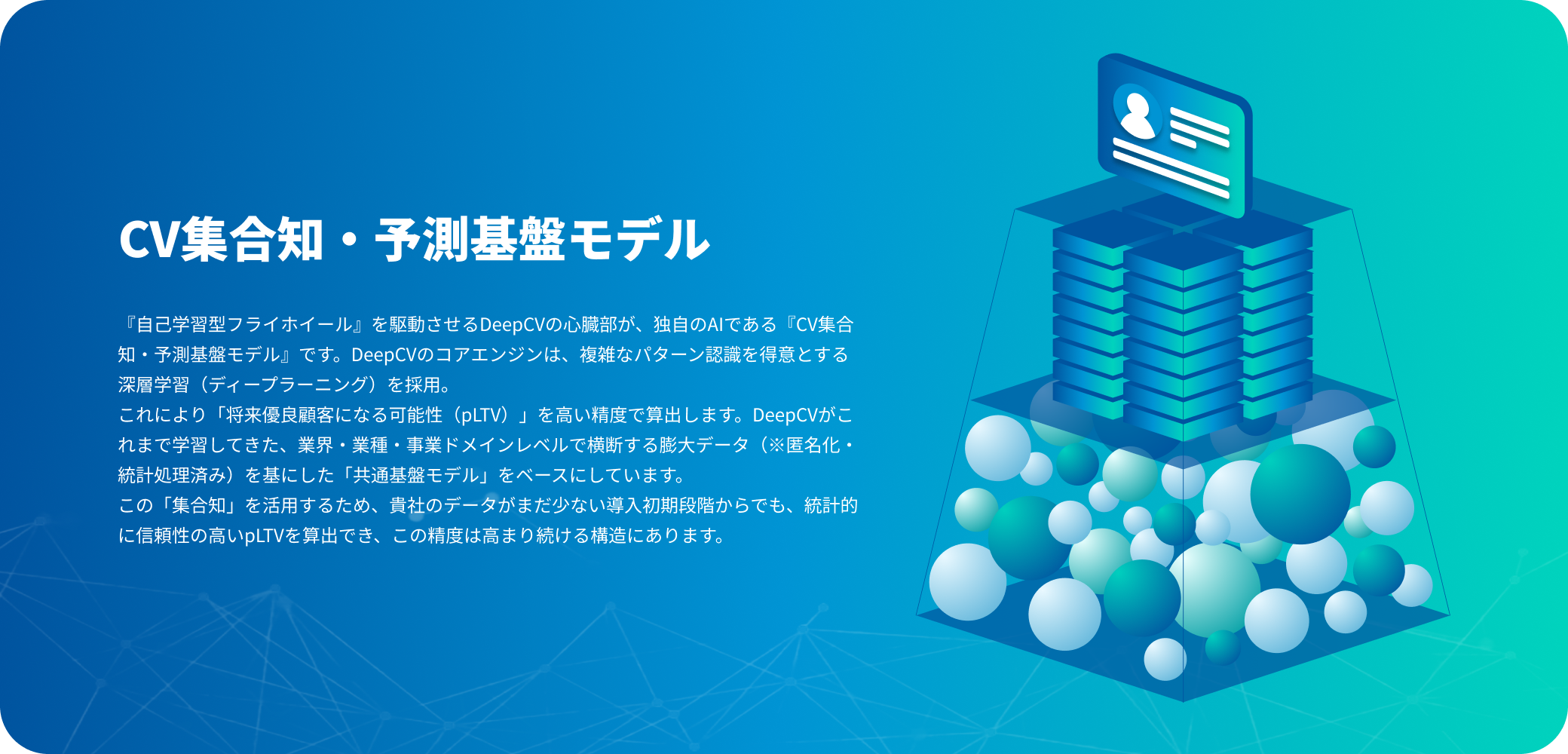 ステップ05で得られた学習・修正結果や、匿名加工・統計処理された全てのCVデータは、DeepCVの『CV集合知・予測基盤モデル』に集約されます。これにより、集合知としてモデルが常に進化し、予測精度を継続的に向上させ続けます。
